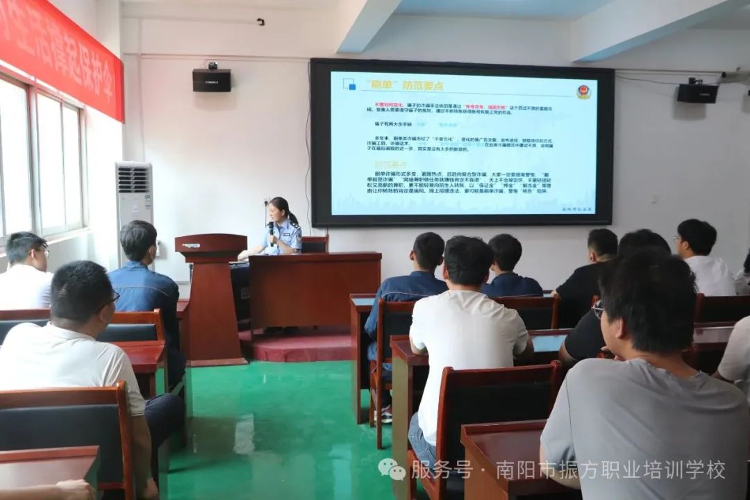 为有效提升师生防范电信网络诈骗的意识和能力,切实保障师生财产安全,2025年6月13日,振方职业培训学校特邀张衡所七里园警务室民警张蜀娅和辅警张璐走进校园,开展反诈专题宣讲活动。
